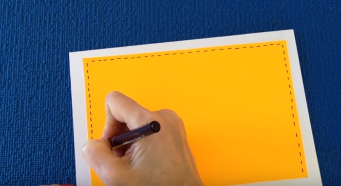 Белый картон сложите вдвое и обрежьте. Затем из разноцветной бумаги вырежьте прямоугольник на 2 см меньше с каждой стороны, нежели половина листа картона. Склейте картон и бумагу, уложив ее по центру. Ручкой на бумагу нанесите штрихи.