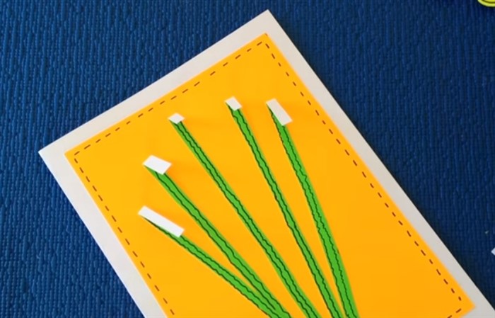 Разместите полоски на открытке, а затем приклейте, не нанося клей на верхушку полоски на разном расстоянии.