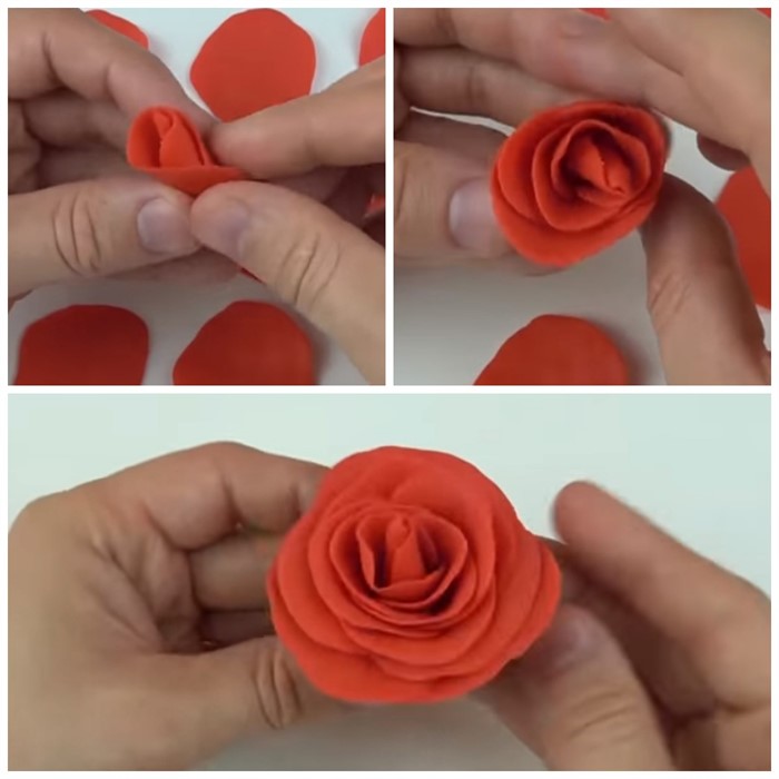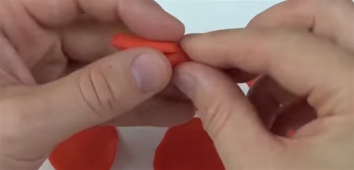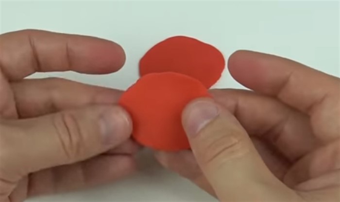 - Кусочек красного пластилина скатайте в шарик, а затем тонко его раскатайте, чтобы форма была максимально приближенная к круглой. Чем больше вы сделаете таких заготовок, тем пышнее будет будущая роза.