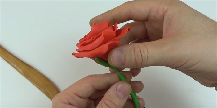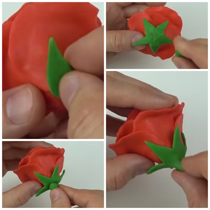 - Из зеленого пластилина сделайте 5 маленьких плоских треугольника, прилепите к основанию розы.