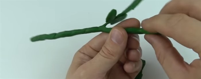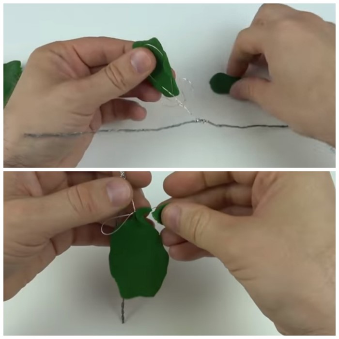 - Тонкие пласты зеленого пластилина приложите к лепесткам из проволоки с обеих сторон и сплюсните.
