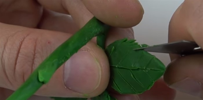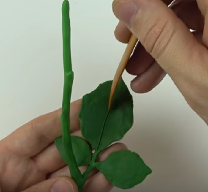 - Зубочисткой или стеком нанесите прожилки на листочки.