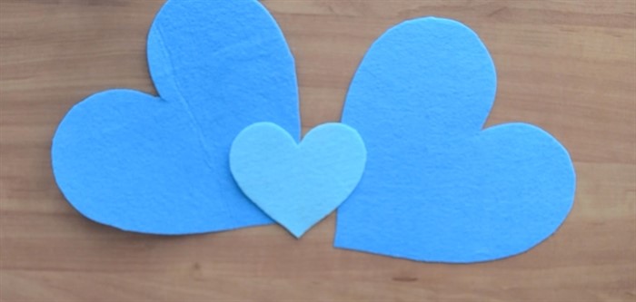 Сделайте на бумаге 2 шаблона с сердцам меньшего и большего размера на свое усмотрение. Далее приложите шаблоны к фетру и вырежьте 2 больших сердца одного цвета и сердечко поменьше — другого.
