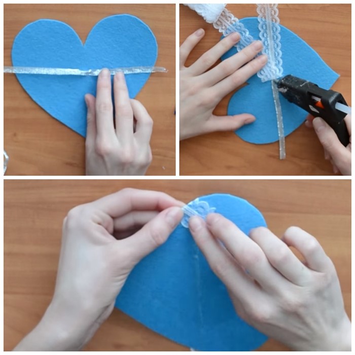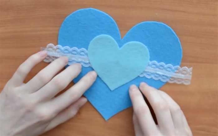 На средину одного из больших сердец приклейте декоративную ленту, а поверх ленты приклейте кружево. Ленту и кружево зафиксируйте на обратной стороне сердца.