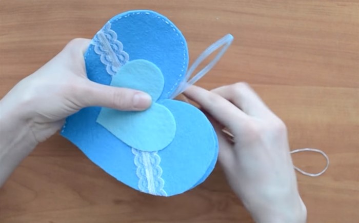 К обратной стороне этого сердечка приклейте петельку из декоративной ленты. Сшейте 2 больших сердца между собой, оставив небольшое отверстие.