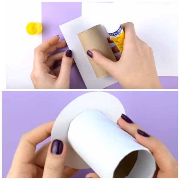 - Втулку от туалетной бумаги обклейте двухсторонней цветной бумагой.