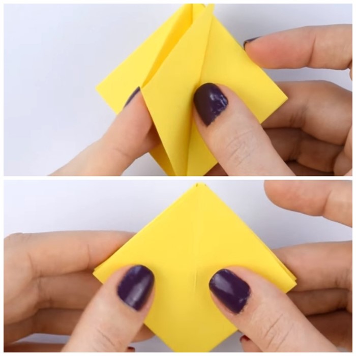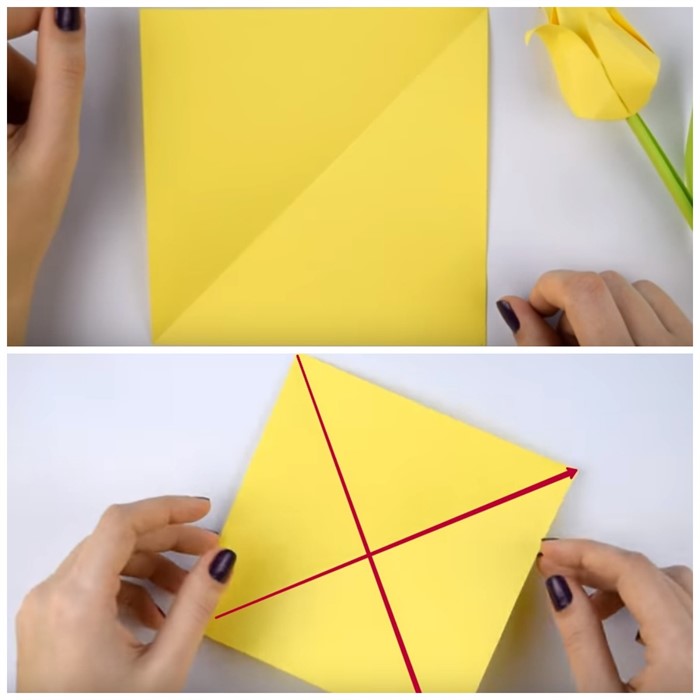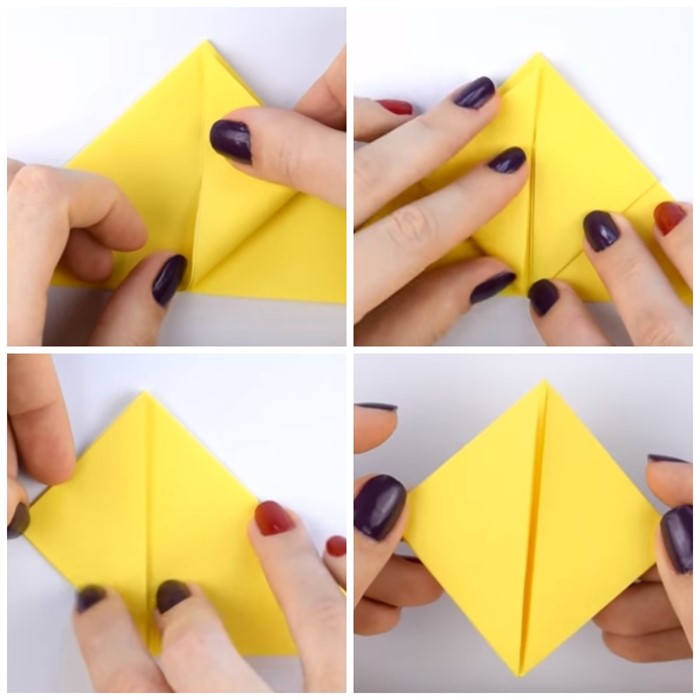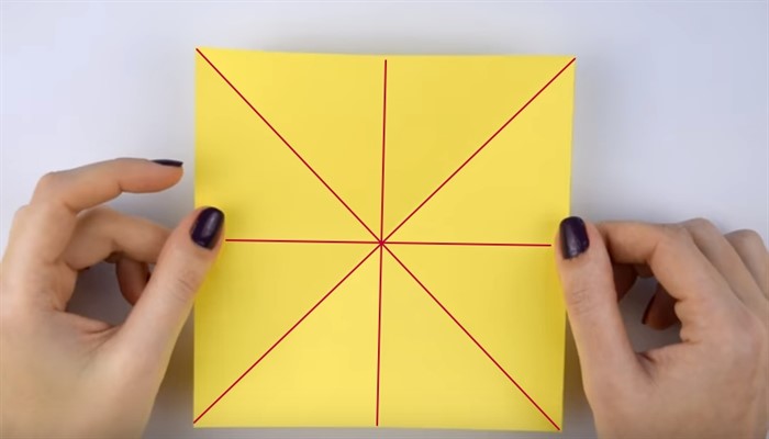 - Квадрат офисной двусторонней бумаги 15х15 см сложите по диагонали пополам, затем разверните и сложите по диагонали с противоположной стороны.