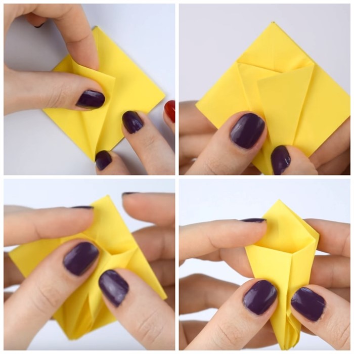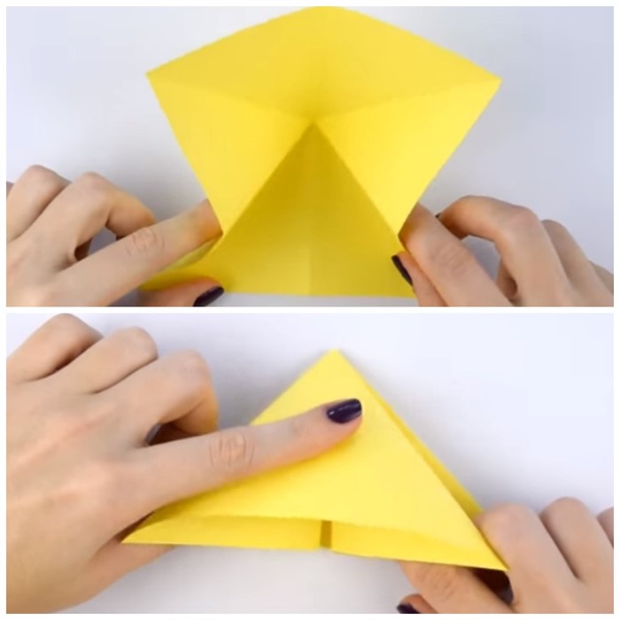 - Удерживая палец в центре внизу, загните сначала левый угол наверх, заходя за центральную линию, а затем правый. После чего правый уголок заведите в кармашек левого. То же самое проделайте на обратной стороне.
