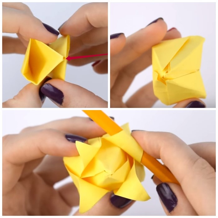 - Кончики лепестков закрутите на карандаш. Сделайте 3 таких бутона.