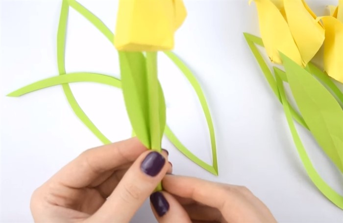 - Из той же бумаги вырежьте листочки разного размера. Приклейте к стебельку.