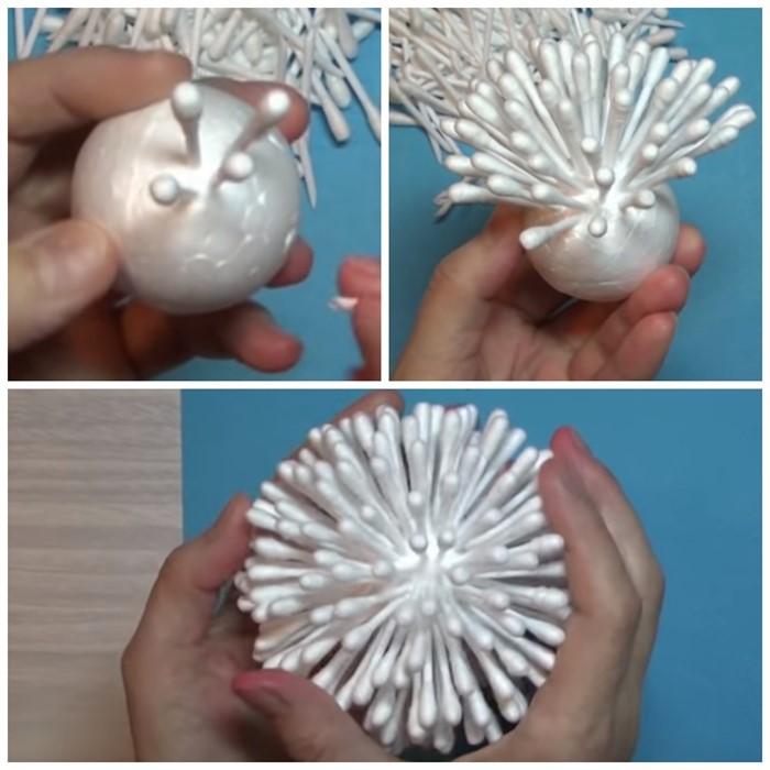 - Возьмите пенопластовый шар диаметром 4 см (можно заменить шариком из фольги) и вставьте ушные палочки по всему периметру.
