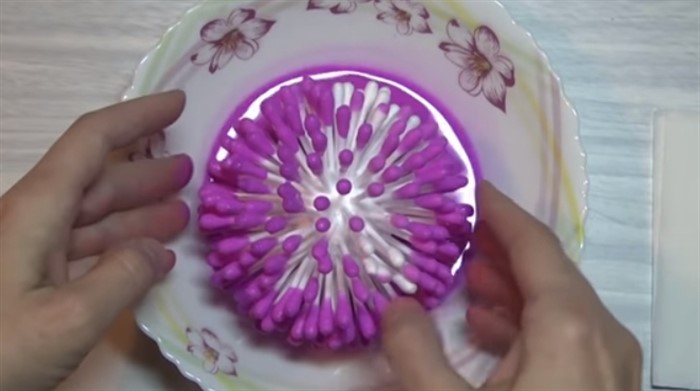 - В емкость налейте немного гуаши и добавьте воды. Окуните шарик, закрасив все ватные палочки.