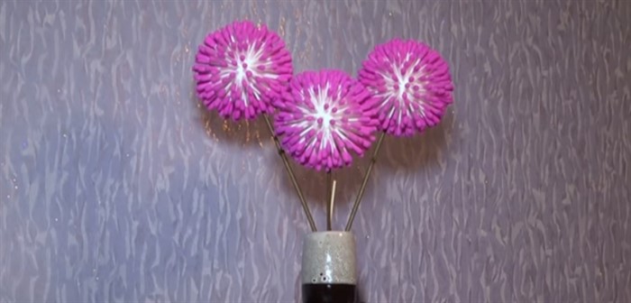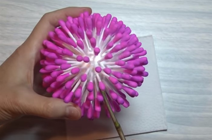 - Наденьте шарик на тонкую веточку. Наделайте столько таких цветов, сколько желаете видеть в поделке.