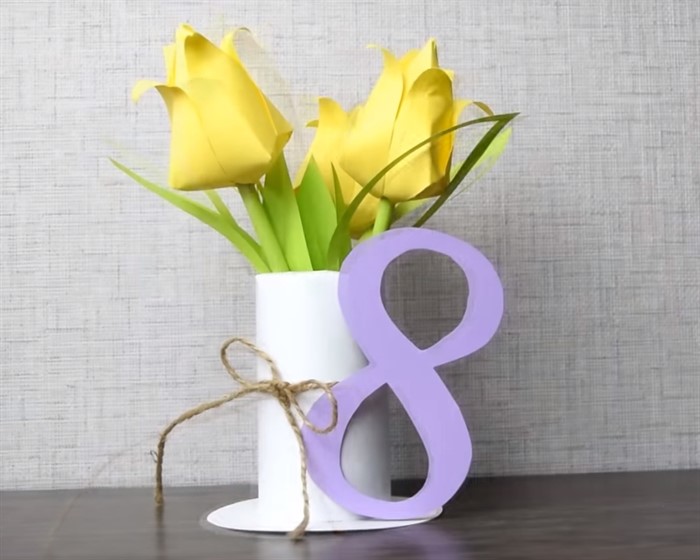 - Сделайте надпись, приуроченную к празднику, например 8 марта и приклейте ее на двухсторонний скотч к вазе.