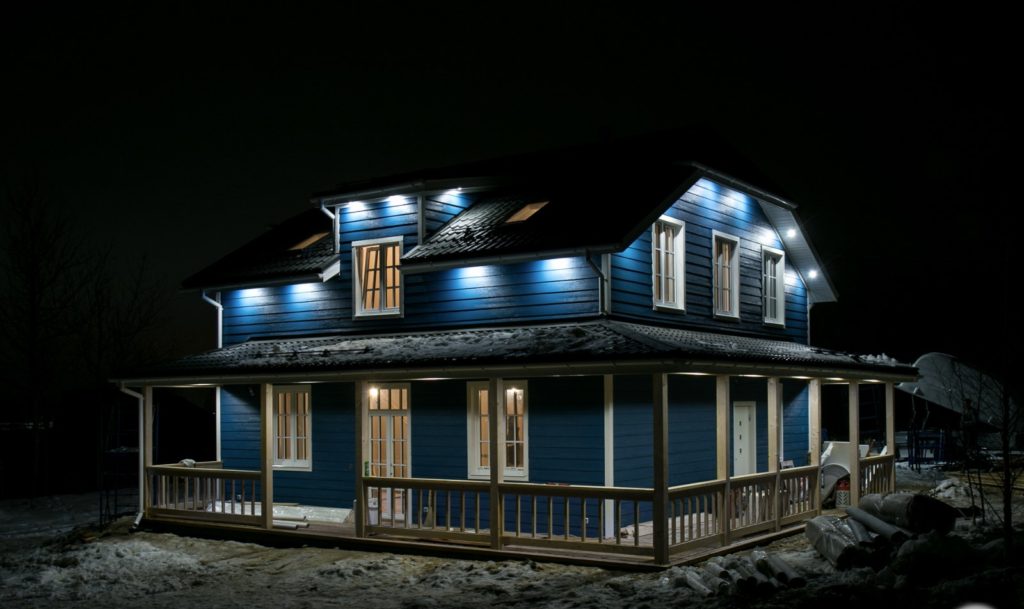 - Декоративные плафоны, защитные корпуса светильников и оболочки гибких гирлянд должны надежно предохранять их от влаги и пыли. При покупке оборудования для подсветки загородного дома поинтересуйтесь характеристикой IP — уровнем пыле- и влагозащиты защиты корпуса. Ее значение должно быть не ниже 65.