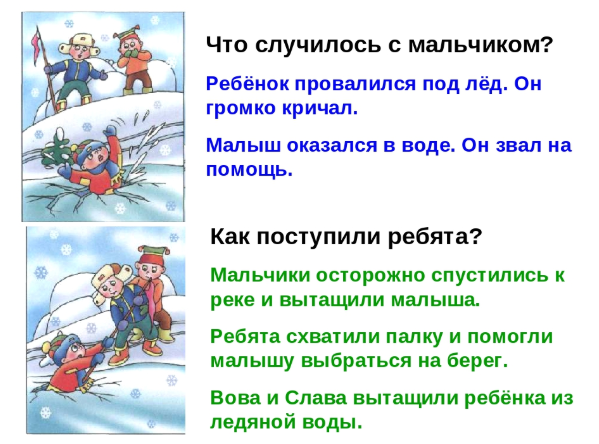 Чтобы использовать картинки с сюжетами максимально, нужно их разрезать и попросить ребенка разложить их в логической последовательности. Затем спросите, почему он их разложил именно так. Пусть опишет сюжет, что происходит на картинках последовательно. В течении рассказа, задавайте наводящие вопросы. Составляя к каждому рисунку предложения и складывая из них рассказ, первоклассник развивается и готовиться к дальнейшему обучению, не только в первом классе, но и на всю жизнь.