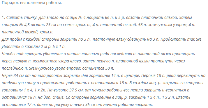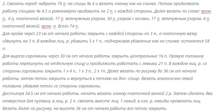 2. После этого начинайте вязать спинку лицевой гладью или выбранным узором в соответствии с выкройкой. Если узор сильно объемный, то по краям работы нужно несколько петель вязать лицевыми, чтобы в дальнейшем при сборке шов не смотрелся грубо.