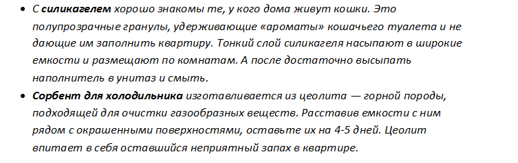 Для борьбы с неприятным запахом после покраски, можно бороться с помощью абсорбирующих средств. У них есть один недостаток, поглощение влаги. Поэтому в помещении нужно установить на время ведра с водой.