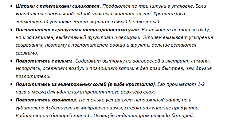 Бороться с появлением плохого запаха в холодильной камере можно с помощью специальных средств, которые поглощают выделяемые продуктами ароматы: