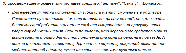 Использовать нашатырь не стоит. Коты могут реагировать на его состав, аммиак сильно похож на выделяемый с мочой компонент, что приведет к последующим лужам именно в этом месте.