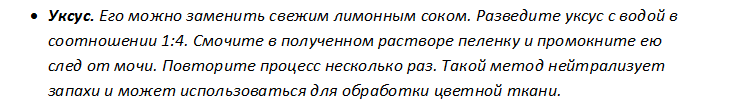 В первую очередь рекомендуют использовать уксус, он быстро удаляет запах. Обработанные участки должны полностью просохнуть, только тогда можно использовать другие методы, если этот окажется не эффективным.