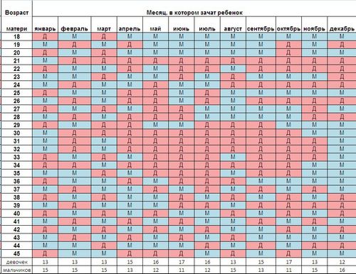 В крайней левой колонке отыщите возраст матери, в правой части расположены месяцы зачатия. Найдите их на пересечение и узнайте результат. М — мальчик, Д — девочка. Рассмотрим более подробно на примере. Допустим, будущей матери исполнилось 22 года. Зачатие произошло в марте. Отсюда следует, что на пересечение данных показателей стоит М, а значит, будет мальчик.