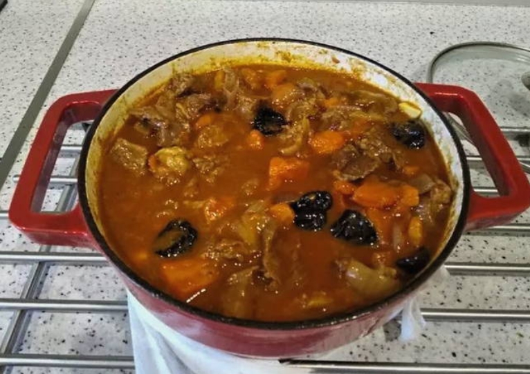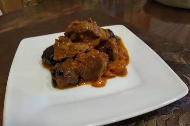 Сушеная слива придает говядине особый вкус, на выходе она получается сочная и мягкая. Но, чтобы его приготовить, потребуется не менее четырех часов времени. Норма продуктов рассчитана для приготовления восьми порций.