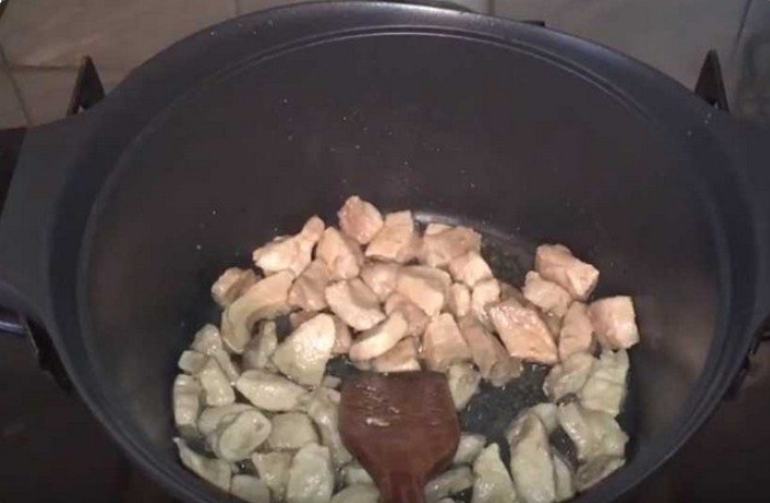 - Обжариваем недолго мясо, пока оно не приобретет бледный цвет.