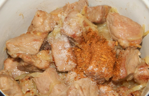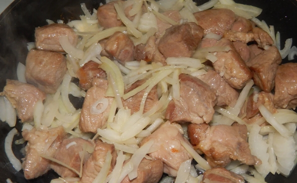 - Как только мясо подрумянится, настало время добавить к нему лук.