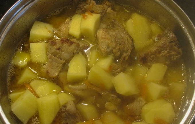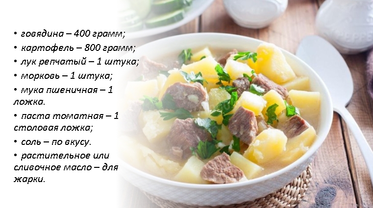 - Чтобы говядина получилась тушеной, а не вареной, воды или бульона много не добавляют, на поверхности жидкость должна едва покрывать содержимое кастрюли или сковородки.
