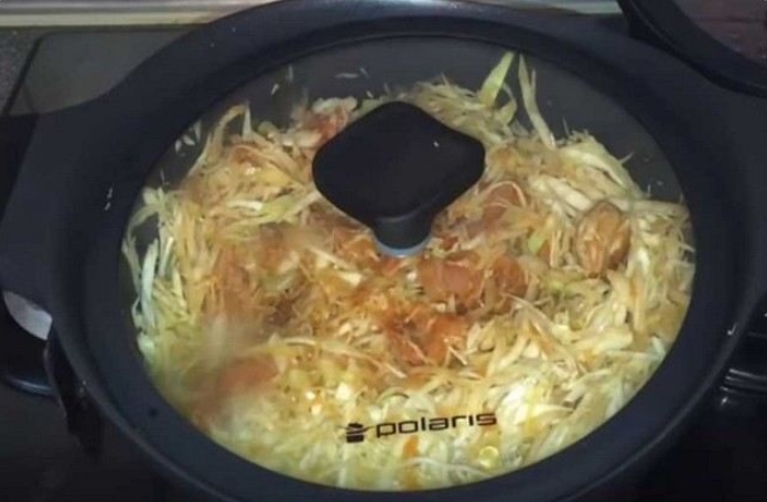 - Капусту, нашинкованную тонкими полосами, отправить к мясу.