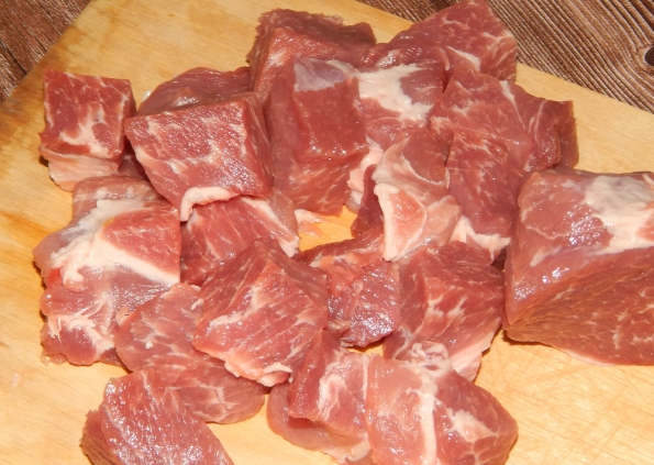 - Мясо моем, обтираем салфеткой, нарезаем на кубики.