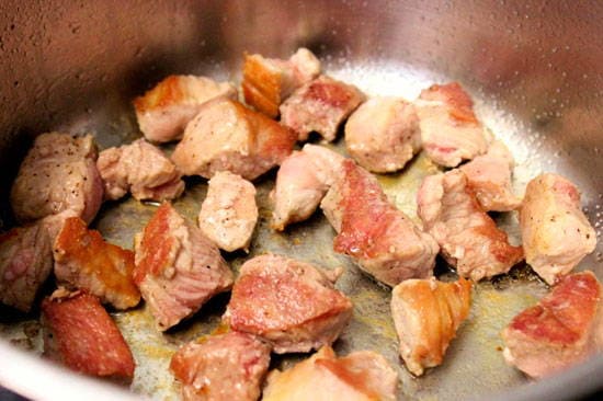 - Сначала нужно раскалить сковородку и обжарить на ней кусочки свинины пока они не подрумянятся со всех сторон. Так в мясе сохранится сок.