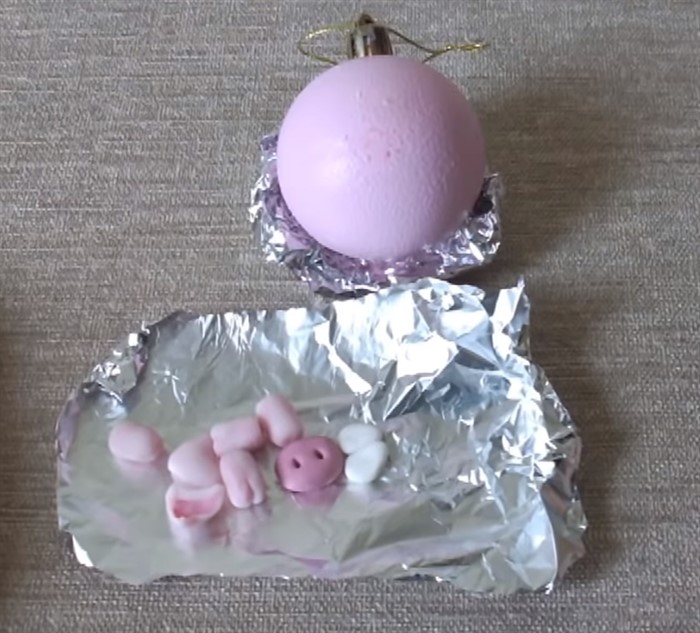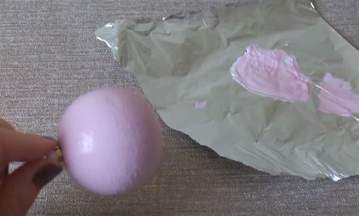 Возьмите елочный шарик, снимите с него петельку и покройте розовой акриловой краской. Дайте высохнуть.
