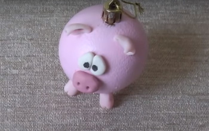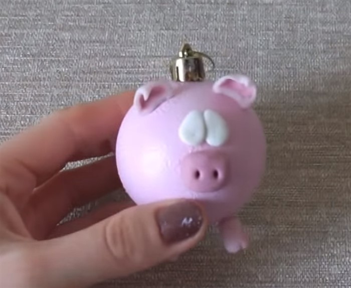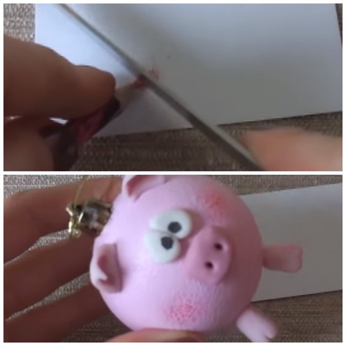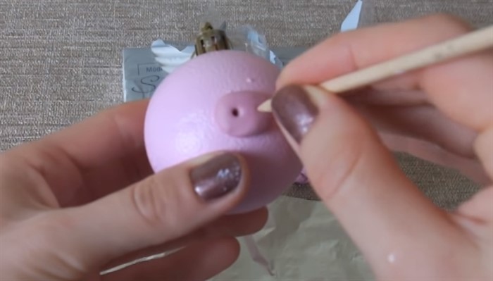 Прикрепите назад петельку. Из полимерной глины розового (более темного оттенка) сделайте пятачок, прикрепите к шарику, а зубочисткой сформируйте носик свинки.