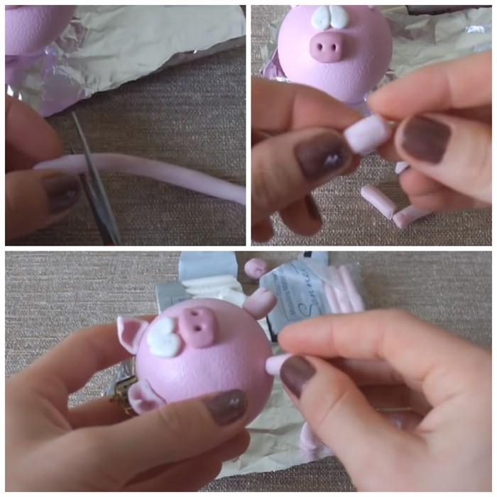 Скатайте кусочек глины в небольшую колбаску, разделите ее на 4 части и сформируйте ножки поросенка.