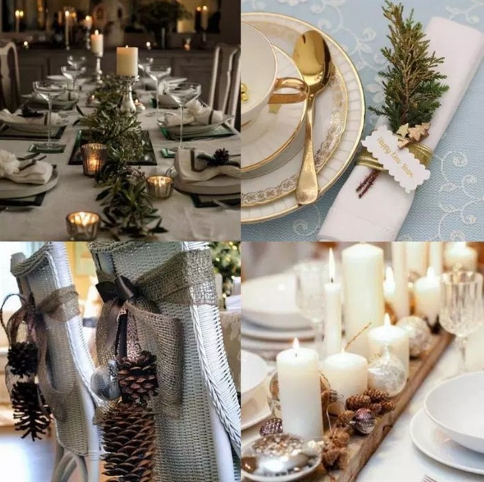 Украшение стола — завершающий элемент декора и не менее важен, чем украшение всего жилища. Сервируя стол, отдавайте предпочтения тканевым салфеткам в тон домашнему декору. По центру стола разместите маленькие вазочки с украшением и шишками, а по столу расставьте свечи нежных оттенков, установив их в канделябры. Спинки стульев украсьте бантами и задекорируйте шишками и елочными украшениями.