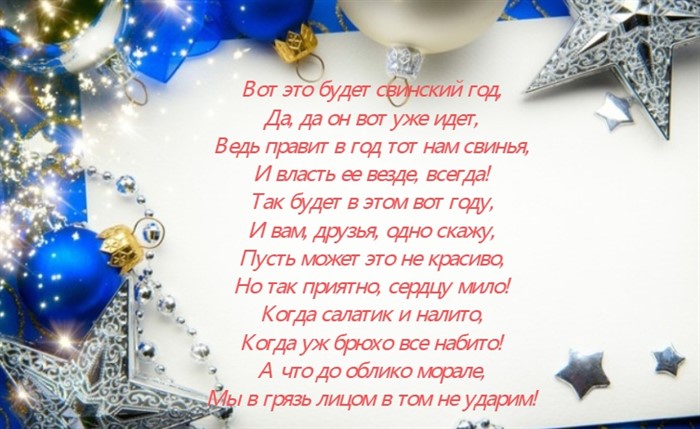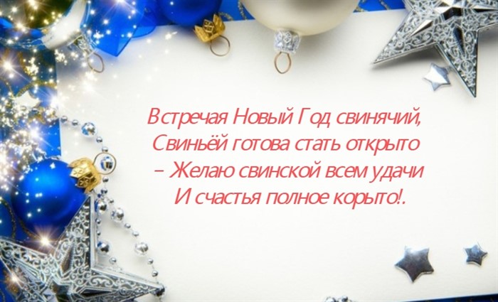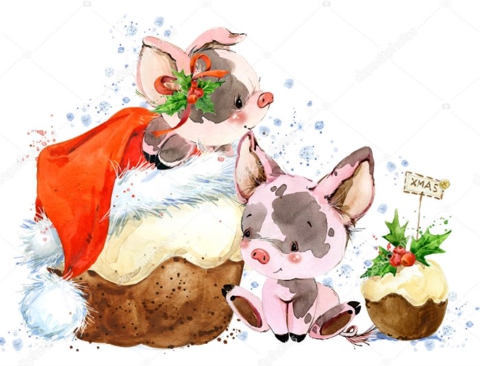 Подбирая меню для новогоднего стола, не забывайте о том, что покровительница этого года любит вкусно и сытно поесть. Свинья не обидится, если на столе будут присутствовать блюда из телятины, кролика, баранины и даже свинины. Можно запечь гуся или утку с яблоками, потушить курятину или индюка, а в качестве гарнира подать горох, нут, фасоль, чечевицу или сою. На столе обязательно должны присутствовать орехи, овощные салаты, сыр, десерты, сдоба, фрукты, молочные продукты, а так же зелень, которой можно украсить и сам стол. Выбирая алкогольные напитки, отдавайте предпочтение игристому, коктейлям и вину.