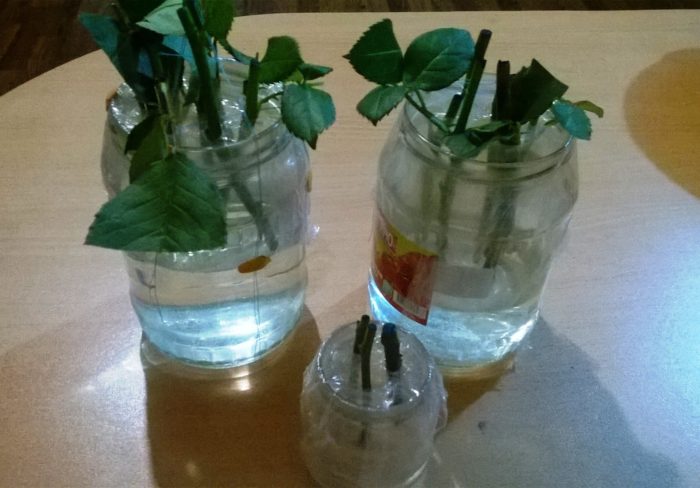 Черенок проливают теплой отстоявшейся водой и накрывают пластиковой бутылкой с крышкой. Периодически отвинчивают крышку и дают черенку проветриться. Розы ставят на теплый подоконник с рассеянным светом, поддерживая температуру 18-20°.