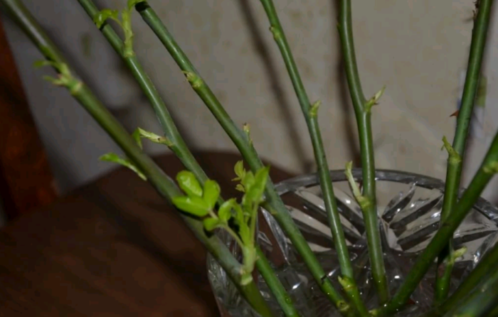 На укоренение обычно уходит 20 дней. Появляются белые корни, которые можно заметить прямо в прозрачном стакане. А из боковых почек появляются молодые веточки. В дальнейшем черенки доращивают до весны.