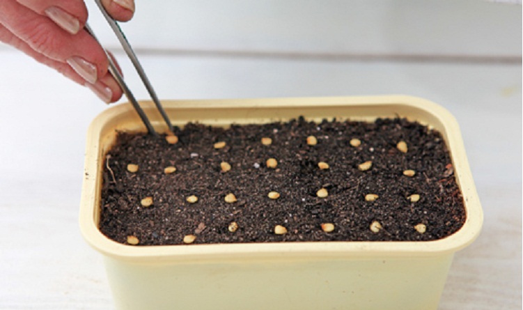 Семена укладывают в заранее обработанную почву, немного присыпая сверху. После посева ящичек прикрывают пленкой, помещают под лампу. Освещение длительное, не менее 25 дней. После 10 дней появятся первые проростки, пленку нужно будет снять. Увлажнять по надобности.