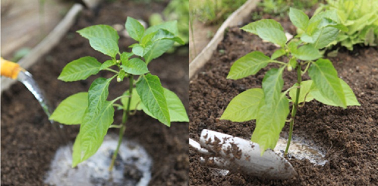 Засыпьте ямку вместе с перцами больше чем на половину, следом сильно полейте. Каждому растению не меньше третей части большого ведерка. После полного поглощения воды землей, засыпаете окончательно ямку.