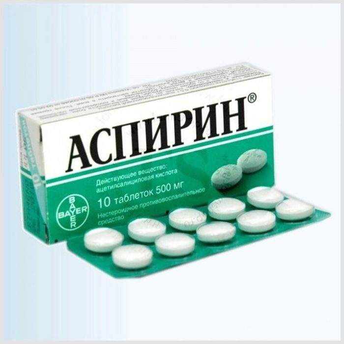 Ацетилсалициловая кислота или Аспирин  — доступный безрецептурный аптечный препарат. Таблетки снимают болевой синдром в дозировке 0,25, 0,5, 1,0 г 3-4 раза в сутки. Основные побочные эффекты: влияние на ЖКТ, аллергические высыпания, побочное воздействие на слух и зрение. Чтобы ослабить негативное действие на желудок, таблетки следует запивать щелочной водой.