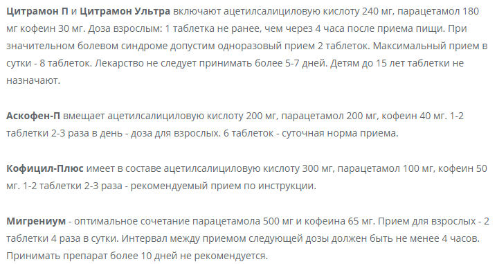 Дополнительные ингредиенты потенцируют действие друг друга, усиливая обезболивающее действие. Анальгезирующий эффект в комплексных лекарствах более продолжительный и с меньшими осложнениями. Предлагаем список наиболее распространенных и эффективных анальгетиков от головной боли.