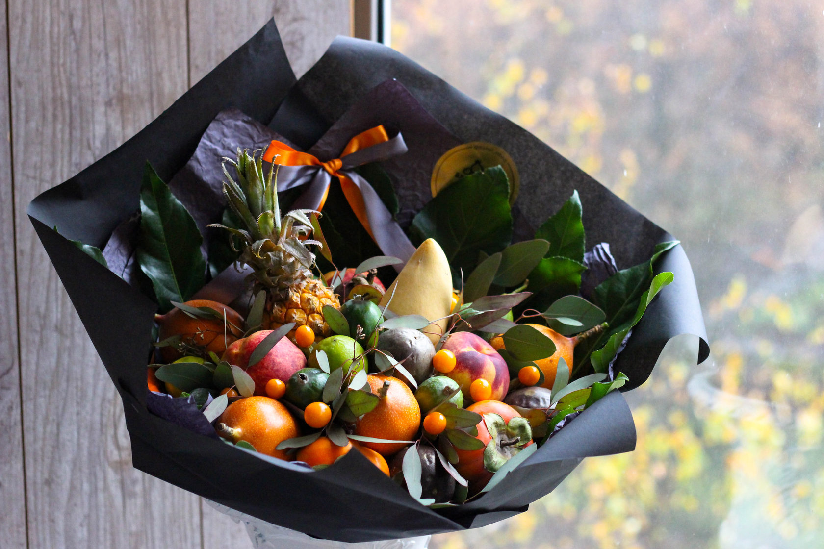 - Букет из экзотических фруктов — выглядит празднично и необычно, хороший вариант для тех дам, у которых уже все есть.