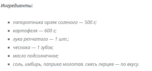 Готовить это блюдо можно как из свежего, так и из засоленного орляка. Соленый — нужно предварительно вымочить в прохладной воде в течение суток и хорошо промыть.