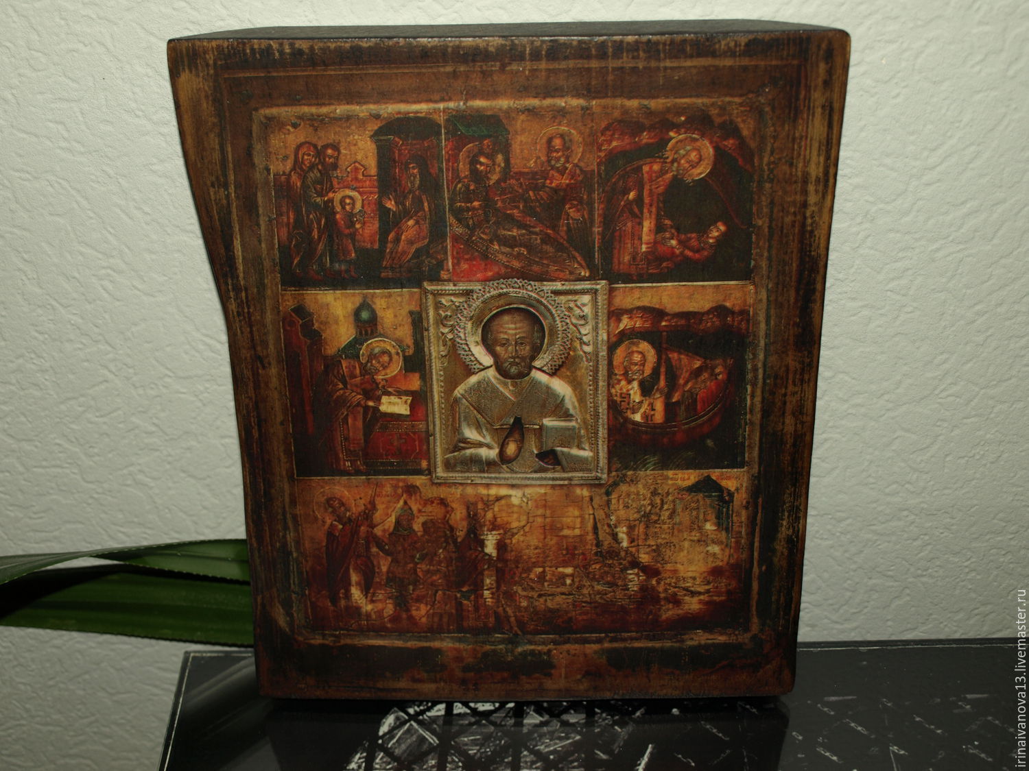 Икона представляет собой гравюры, которые изображают жизнь и деяния святителя, их 8: