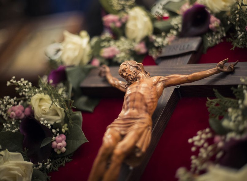 Далее священнослужитель несет выносной большой запрестольный крест.