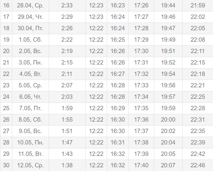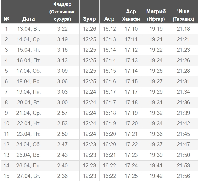 День поста начинается с восходом солнца и заканчивается с закатом. Точное время (время МСК) приведено в таблице.