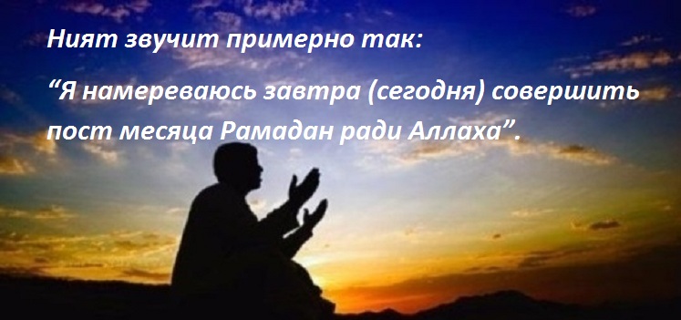 Пост дан мусульманам для того, чтобы они следовали предписаниям и не нарушали их. Мусульманину положено усиленно возносить молитву Аллаху, выражать регулярно свое намерение, которое на исламском звучит, как «ният». Это намерение должно произносится после того, как окончена ночная молитва и еще не начата утренняя.